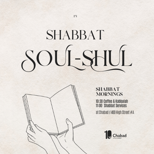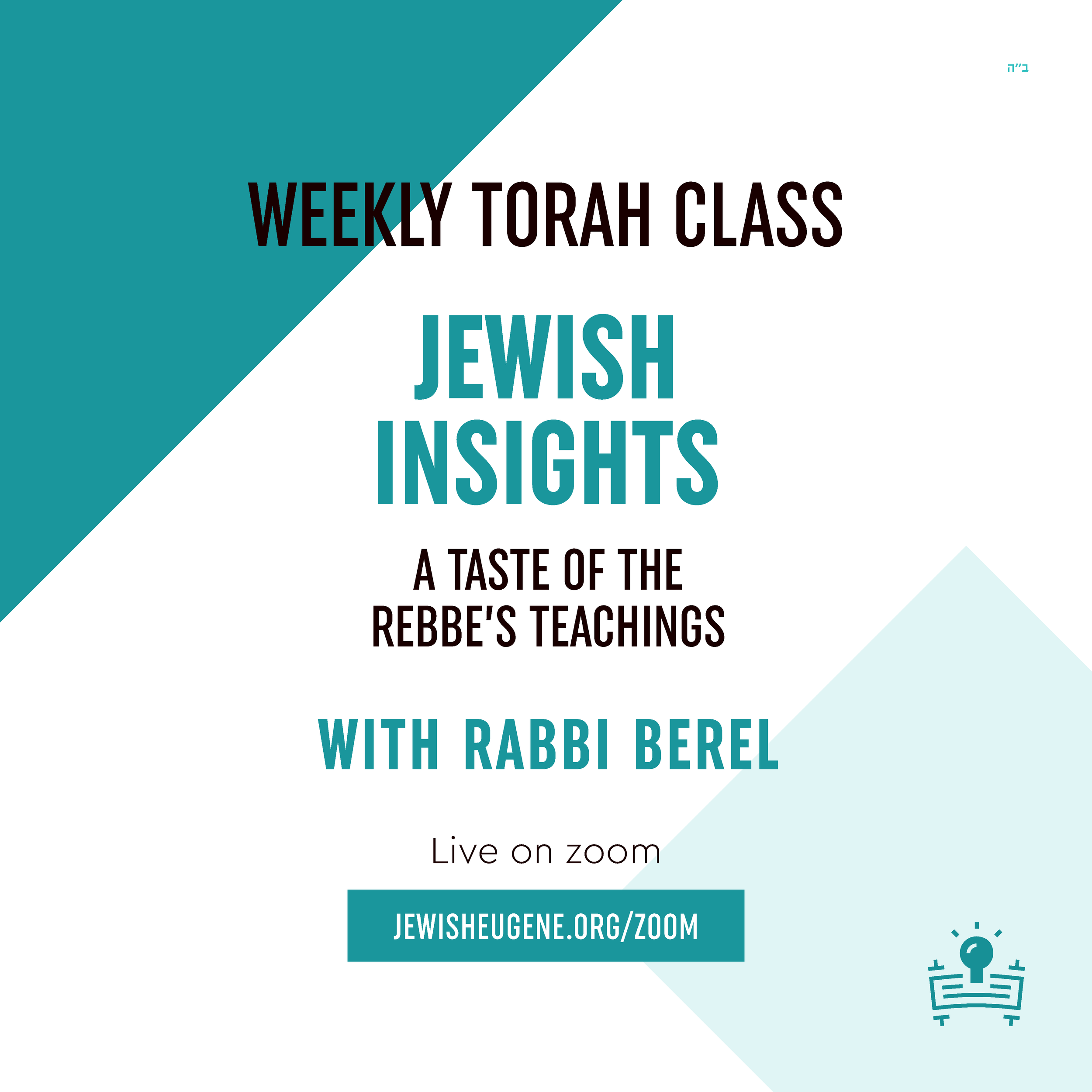 Torah Class Jewish InsightsThursday, 7:30pmA Torah class for the Eugene Jewish community on zoom. Join on zoom Shabbat Dinner Friday, 7:00pmJewish students are invited to join us for Shabbat dinner every Friday night. Learn more Torah Class Saturday morning - for students and Eugene Jewish community!New Tanya course at:10:30 AMfollowed by Services at:11:00 AM and Kiddush at 12:00 PM
